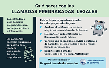Si responde el teléfono y escucha un mensaje grabado en lugar de la voz de una persona en vivo, es una llamada automática pregrabada o robocall. Si está recibiendo muchas llamadas automáticas pregrabadas en las que tratan de venderle algo, es probable que sean llamadas ilegales. Probablemente, muchas también sean estafas.